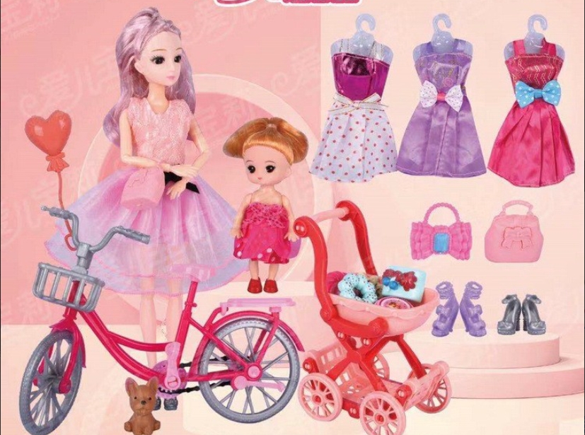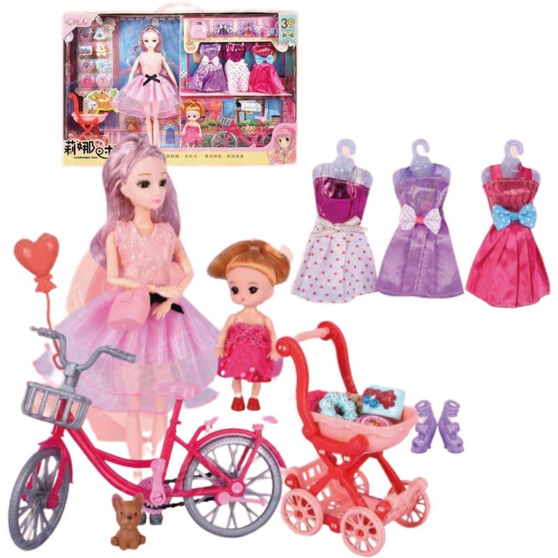 סט בובות משחק עם אופניים עגלה ואביזרים למשחקי דמיון