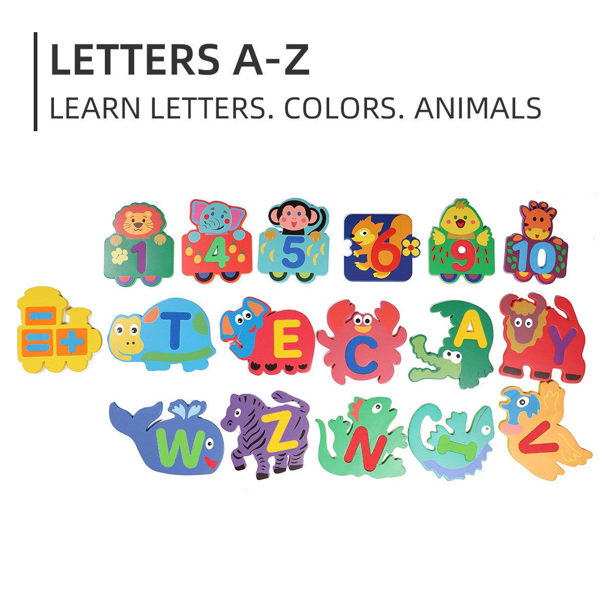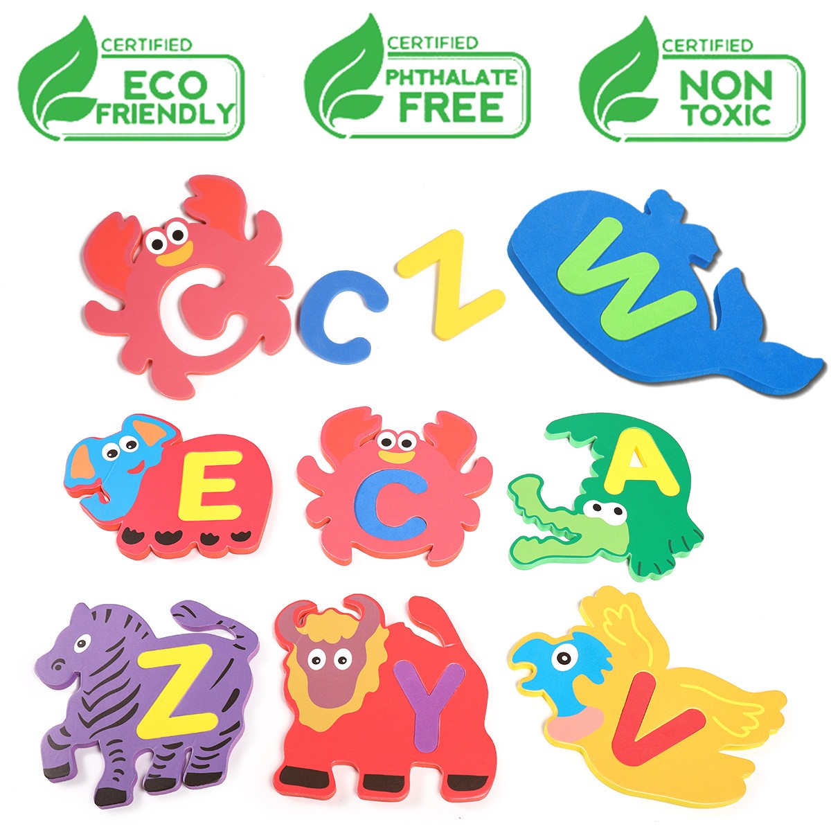 דמויות צבעוניות של חיות עם אותיות ה ABC עליהן
