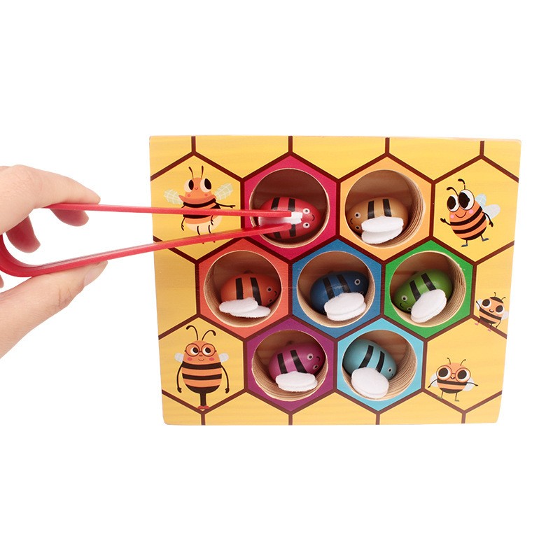 כוורת דבורים מעץ עם 7 דבורים צבעוניות